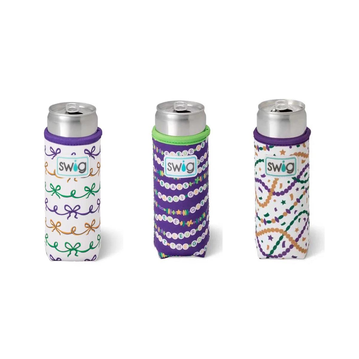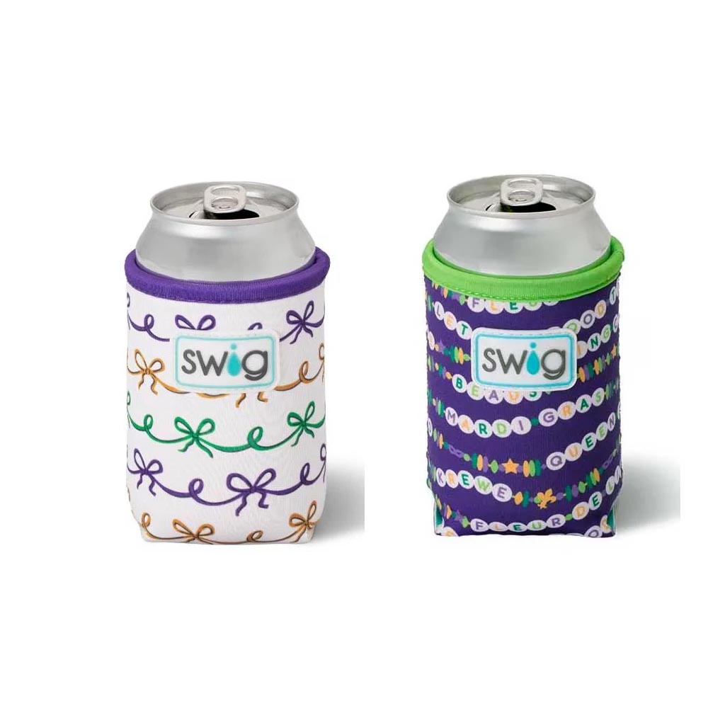 Cool drinks, dry hands! 2 designs-🍺 Mardi on with parade-ready print! on one, And🍺 Cue the beads! Embrace your Mardi Gras Era with these festive friendship bracelets on a glitter lilac background, on the other!